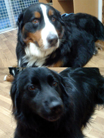 保護してるトイプードルとお客様のビーグルのビーちゃん。ビビり屋のトイプーも未去勢でも流石に男、メス犬のビーちゃんの臭いで少し仲良くなれました。