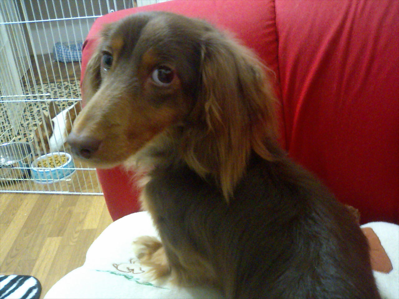 ミニチュア・ダックス君です。今はまだ飼い主さんが恋しいらしく、キュンキュン鳴きながら外を見てます。