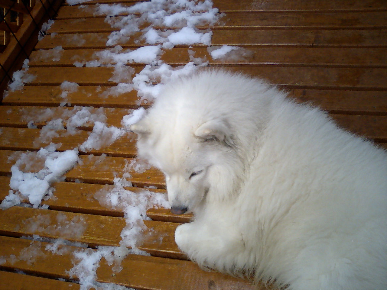 まだデッキには雪があると言うのに、サモエドは外で寝ています。寒いのが好きなのは分かるけどさ、見てるこっちが寒くなるよ。