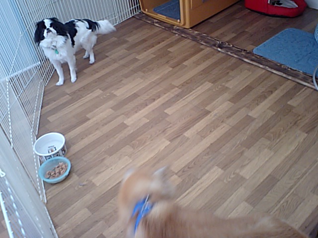 抱いて撫でながら老犬のいるサークルに、やはり怖がる狆ちゃん。大丈夫だよと撫でながら、少しずつ馴らしていきます。