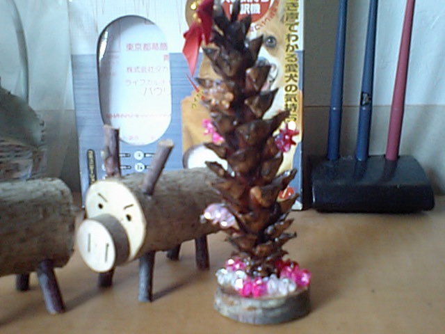 ツリーの隣には、これまた手作りのイノシシのオブジェ。