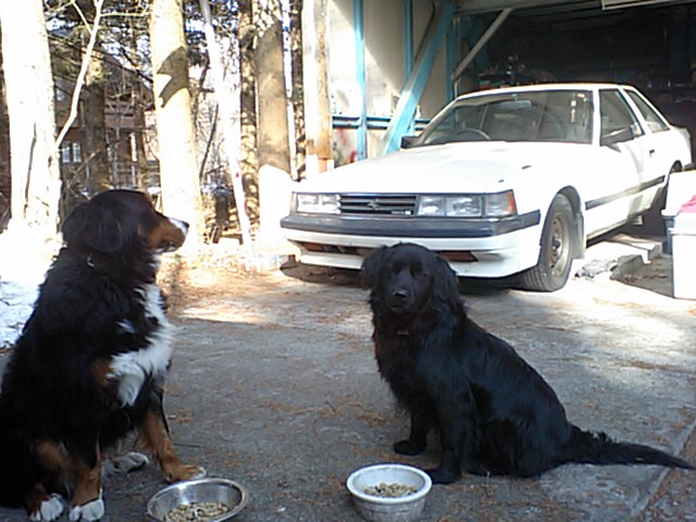 さて、三枚目の写真、とある車の前で我が愛犬二頭。