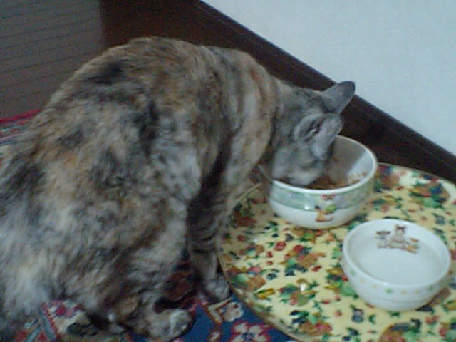 今日はソファーの上でお出迎え。お腹が空いているらしく、盛んに鳴いてご飯の催促です。