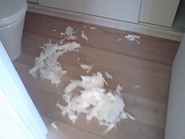 二階の猫トイレを掃除しようとして、ふと人間用のトイレを見てみると、無残にもトイレットペーパーの惨殺死体が… ( ̄○ ̄;)