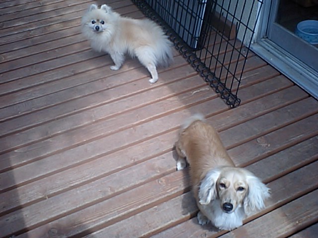 薄曇りですがデッキでくつろいでます。 ダックスちゃんもヨーキーちゃんも、みんな仲良くしていますよ。