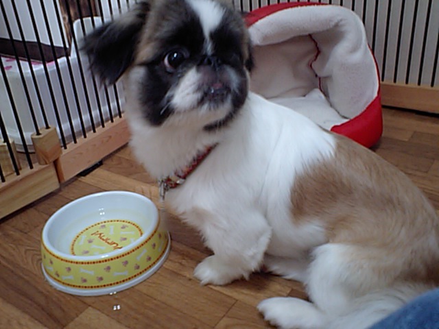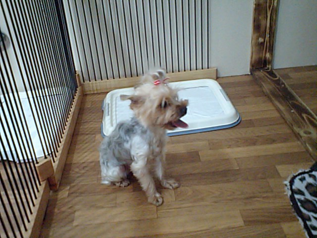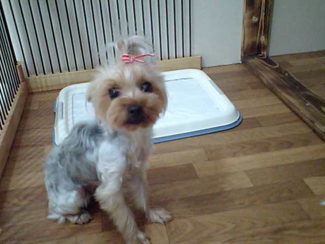 ヨーキーちゃんは髪の毛を縛って貰って可愛いです。サークルから出す事か出来ないので、少し退屈&寂しそう。