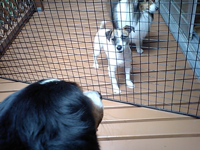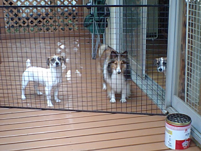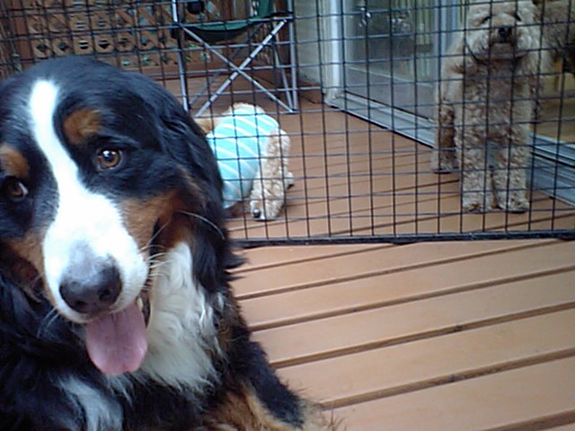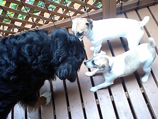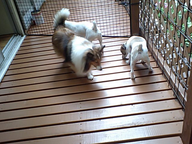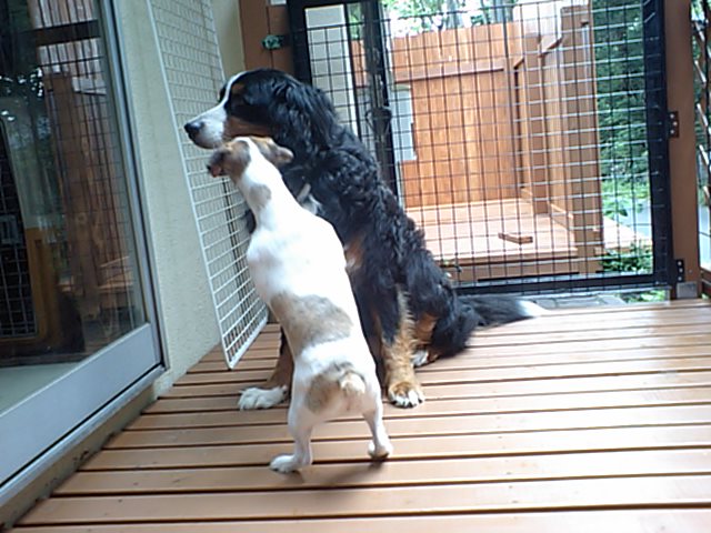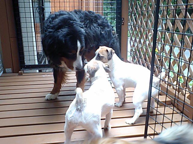 デッキに療養中のバーニーズ(店長の愛犬)を出しました。 すかさずJRTズが遊びに誘いまくりです。