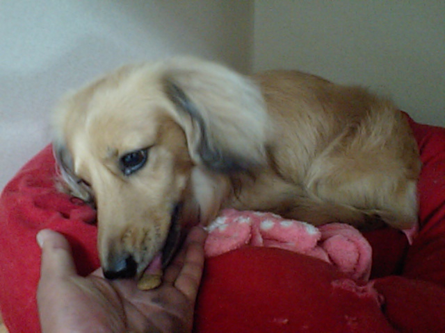 クリームのダックス君は甘えてるのかな?寝床に入ったまま、店長の手から食べてます。