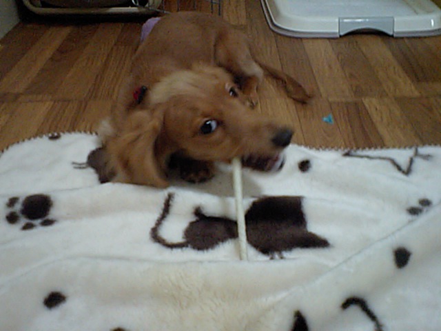 ダックスちゃんはたちまちご飯を完食です。イタズラをするので、ミルクガムをかじってもらってます。