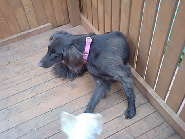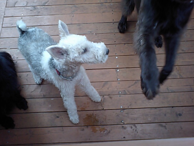 好奇心旺盛で、店内とデッキでバタバタ。シュナウザーちゃんが挨拶してます。