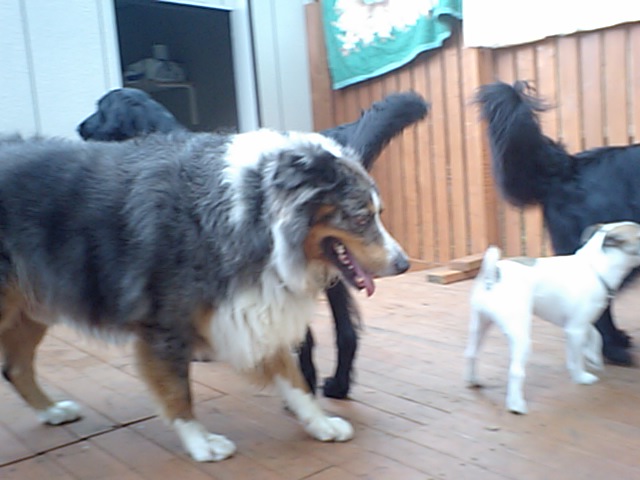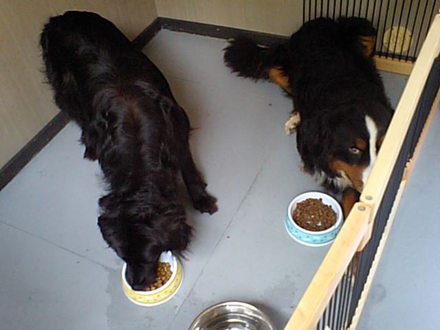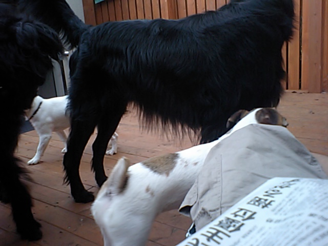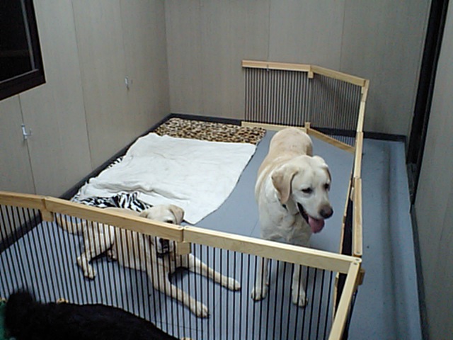 今度は大型犬エリアでのんびりしてます。 オージー君とフラット君は、店長のビニールベッドの左右でのんびりしてます。 だけどジャックラッセルずとなんちゃってフラットがバタバタとウルサい!