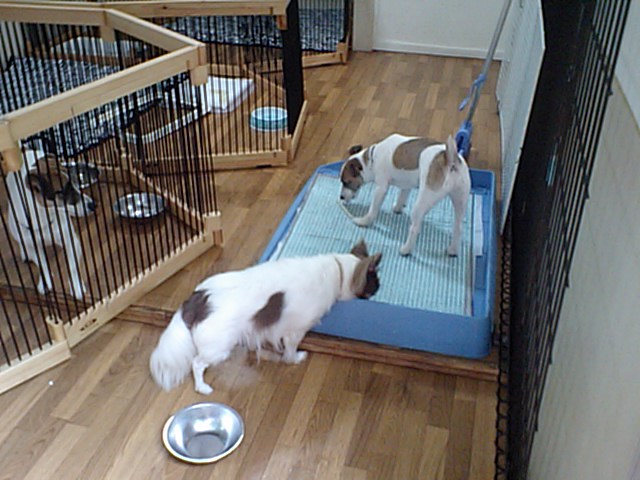 連泊のチワワちゃんは馴染めずに、サークルの中で固まってます…。