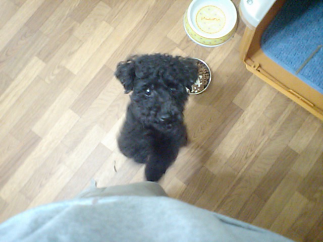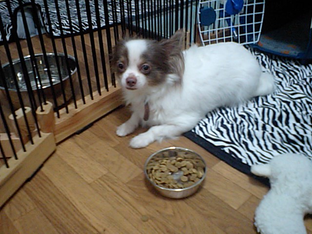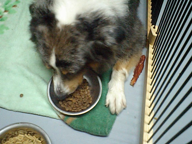 ご飯をあまり食べないオージー君、夜は食べました。 持参のフードを食べないので試しに店長のアイムスを少しあげたら、気に入ったらしくて200cc程食べました。その後に自分のフードも少し食べましたよ。 安心安心 (^o^;)