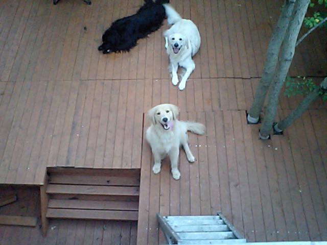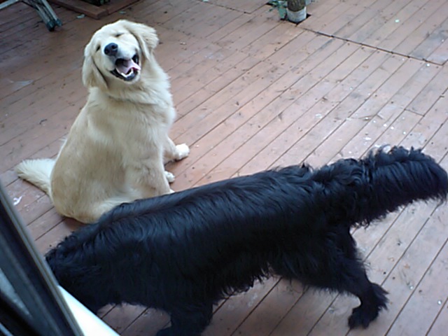 大型犬エリアでは今朝もバタバタ。ご飯を食べて満足そうなゴールデンちゃん。 そして休む間もなくフラットに飛びかかって、バタバタと遊んでます。