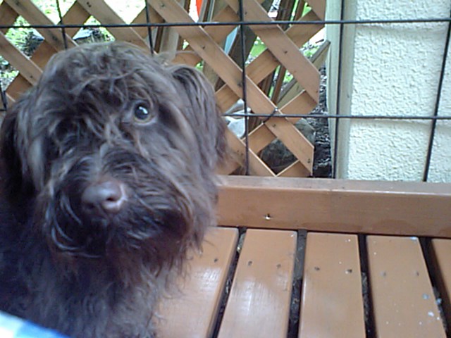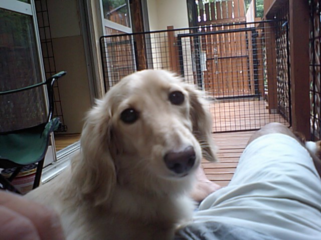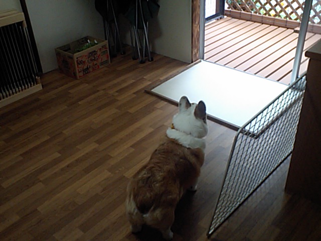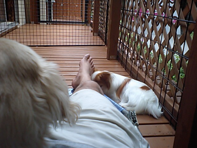 朝には雨も止んだので、デッキでゆっくりしてます。 Mシュナウザーちゃんはお腹の上で、パビヨンちゃんは足元に居ます。