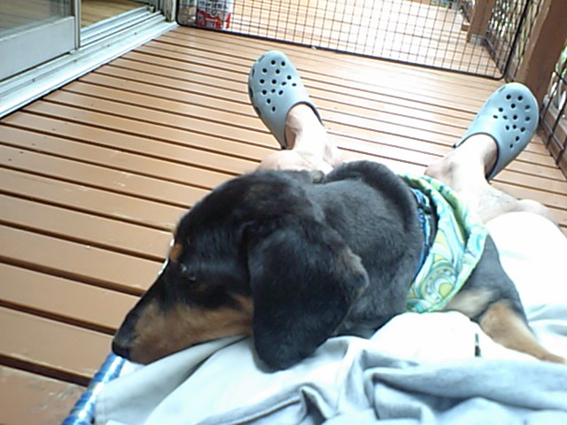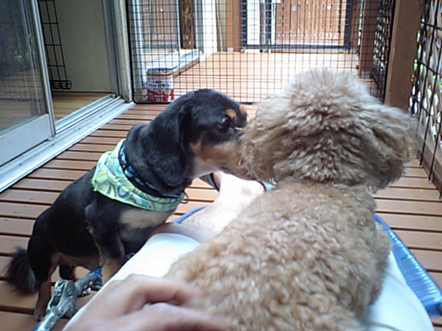 ダックスちゃんまでもが膝の上争奪戦に乱入、もみくちゃにされてる店長です。ってか、重いし暑いよ君達。 Y(>_<、)Y 加わりたそうなトイプーパピーちゃん、やっと少しずつデッキに出てきました。