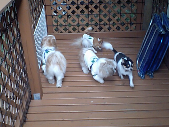 チワワ シーズーちゃんズはご飯を完食。すぐにデッキでバタバタしてます。