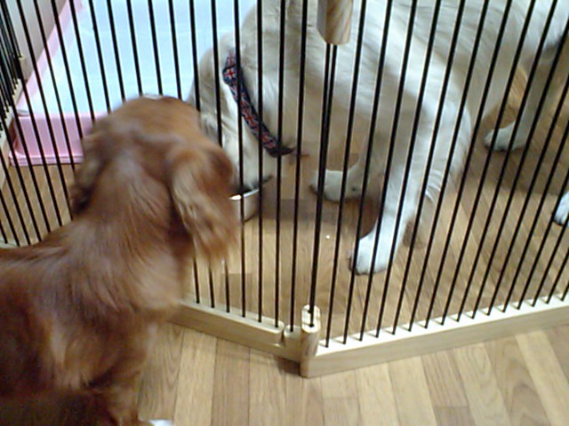 サークルの外では大吉君が食べたそうな顔で見ています。
