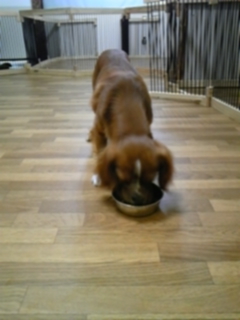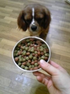 キャバリア大吉君はご飯を食べました。飼い主さんの買ってきてくれた新しいご飯、すぐに食べましたよ。