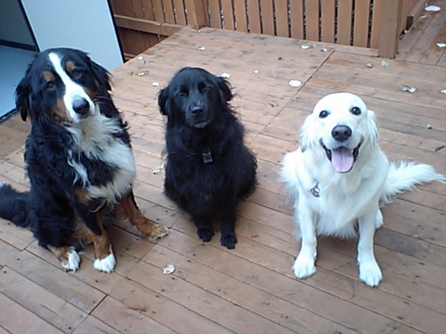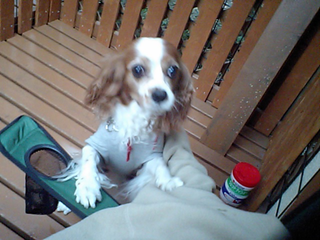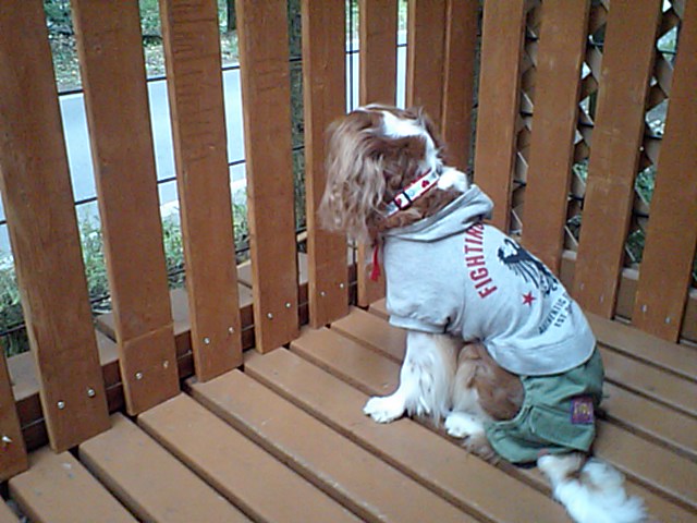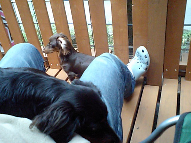 少し寒いですが、みんなでデッキでのんびりしてます。キャバリアちゃんは店長の腕をガシガシして、抱っこしろとせがみます。でもね、ダックスちゃんが退かないのよ。