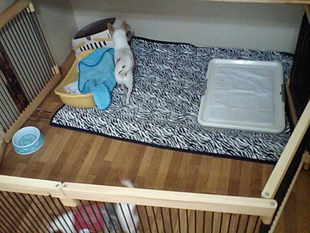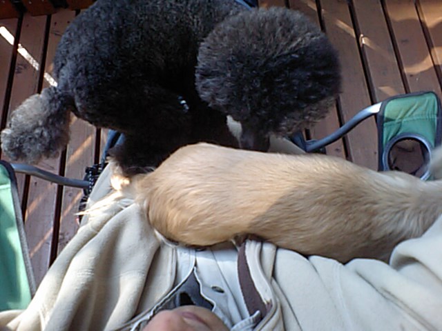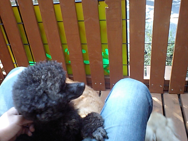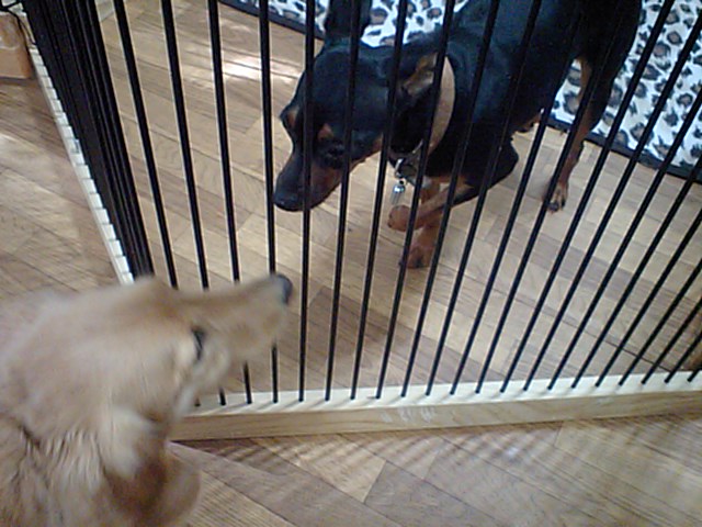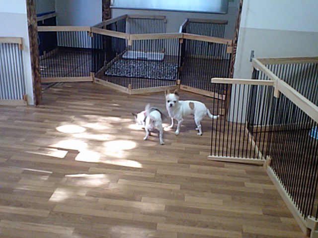最初はサークル越しにハッピー君と吠えてましたが、自らサークルをジャンプして乗り越え、ハッピー君の匂いを嗅ぎに出ました。その後は悠然とデッキに居ます。 勝手知ったるになってるかな?