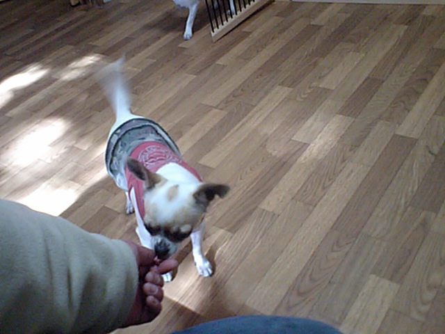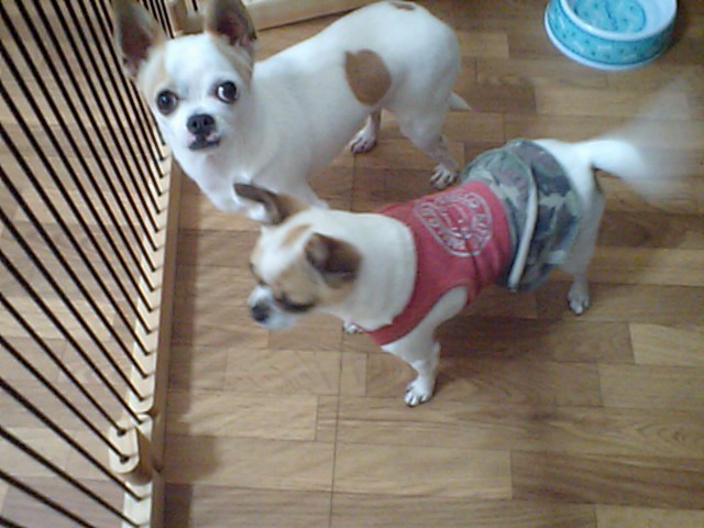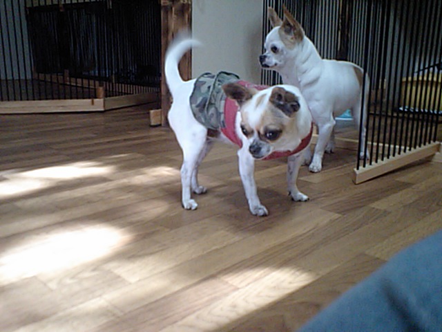 ダディーの雰囲気にも慣れた様子のチワワちゃんズ、サークルから出て店内をウロウロしてます。ミルクちゃんは店長に甘えて来ます。ピッチュー君は甘えたいけど、まだ恐る恐るって感じかな?