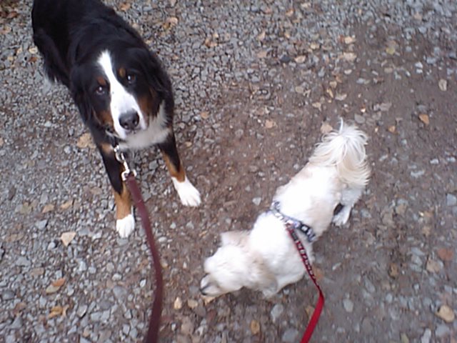 バーニーズちゃんとミックスちゃんはお散歩です。