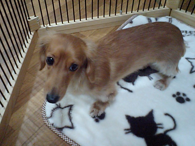 ダックスショコラちゃんはだいぶ落ち着きました。キュ~ンキュ~ンも無くなりました。今は店長の息子と遊んでます。 チワワウィン君は固まってます。 それでも自分のベッドまで移動してました。