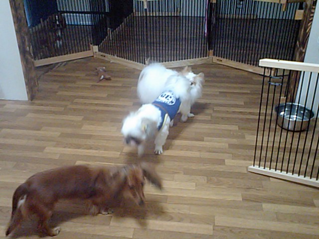 ダックスちゃんは少し怖がりさんかな?吠えてましたが、飼い主さんが居なくなったら諦めた様子です。