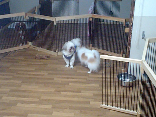 外は雨なので店内をウロウロです。 アクティブで凄かったシーズー君ですが、パピヨン姉さんの方が強かったみたい。パピヨンちゃんの前では大人しくしています。