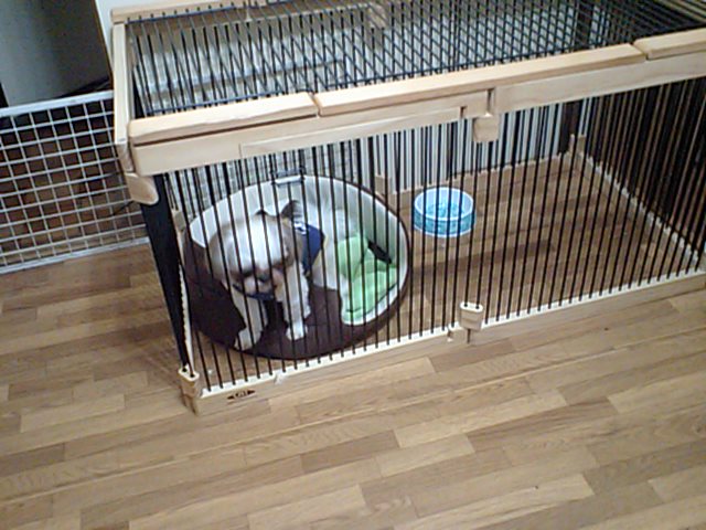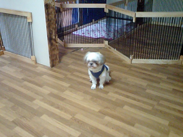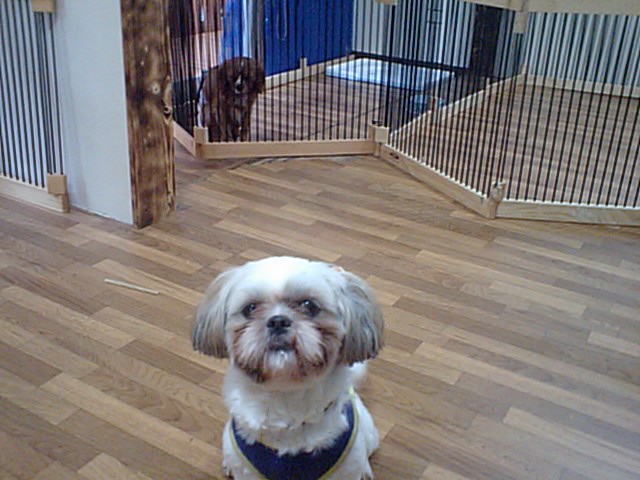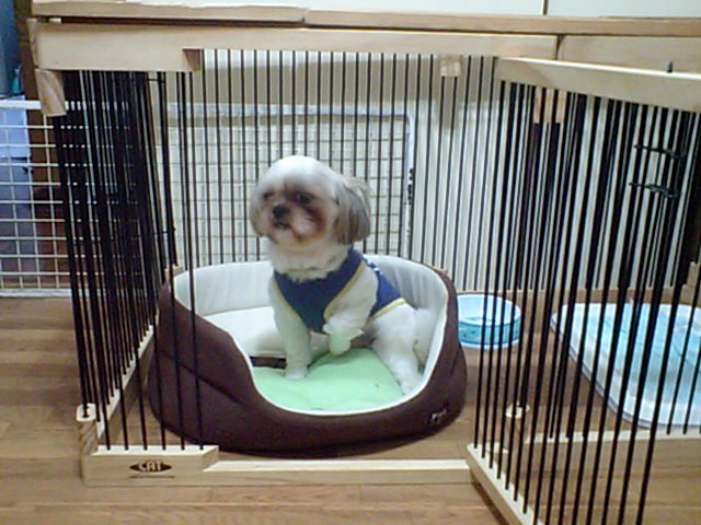 サークルに入れられるとシーズー君は不満そう…。君がしつこいからじゃん?少し落ち着こうよ (・ω・)/