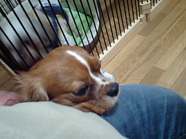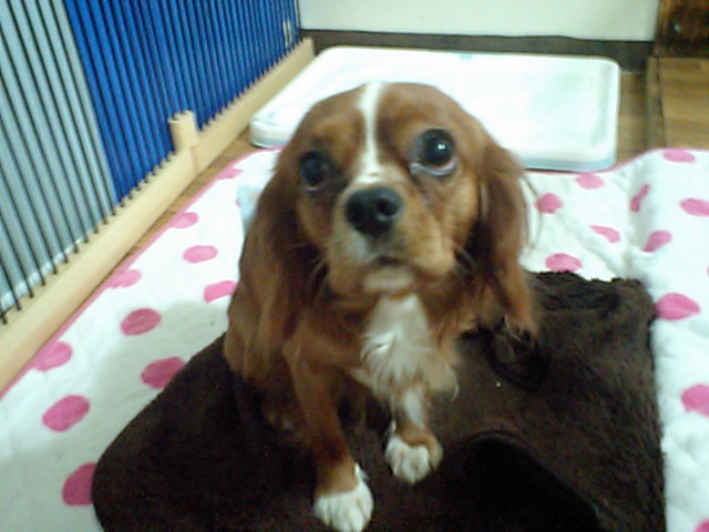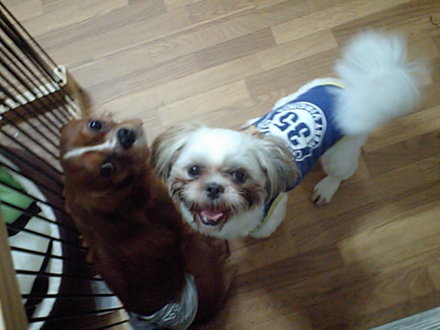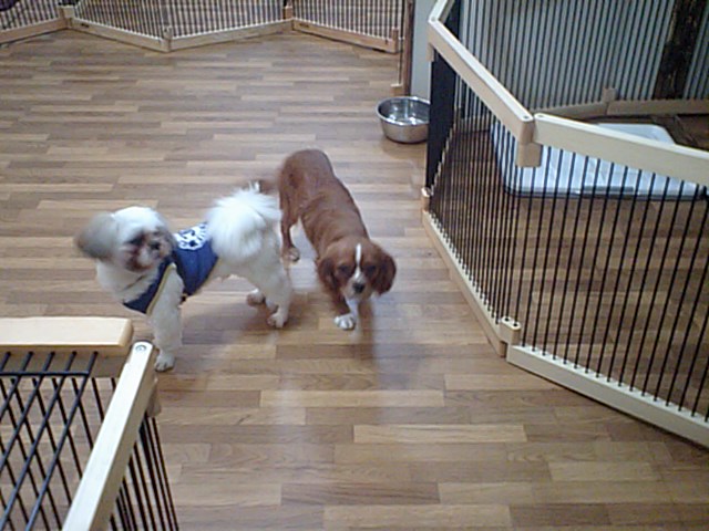 キャバリア君とシーズー君を一緒にすると、シーズー君がキャバリア君にしつこいんです。で、交代でサークルから出してます。