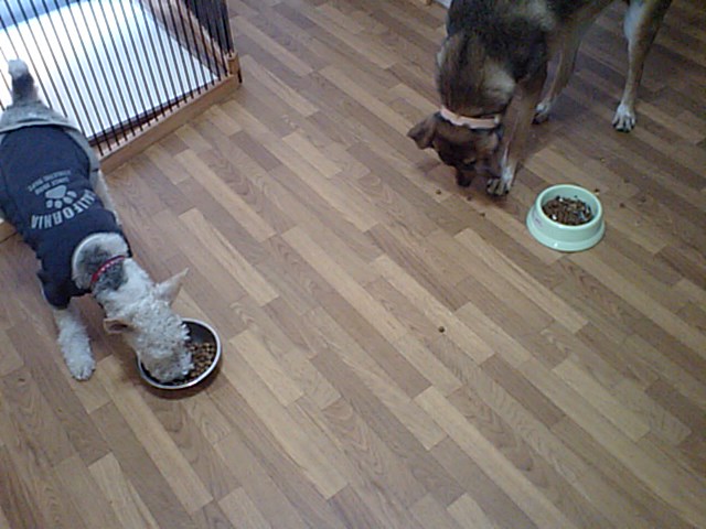 ミックスのアラレちゃんとワイヤーのロビン君、二匹並んで仲良くご飯を完食しました。