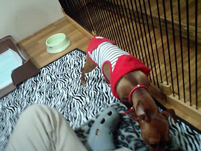 ショコラ君は他のワンコが苦手との事、サークルの中に居てもらいます。