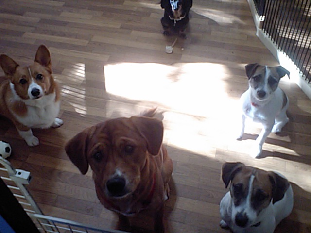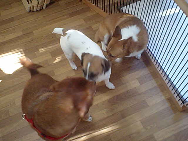 お互いの匂いを嗅ぎ合ってご挨拶して、コーギー・ミックスちゃん達も仲良しの輪に加われました。 今は店長に仲良くおやつをせがんで来ます。