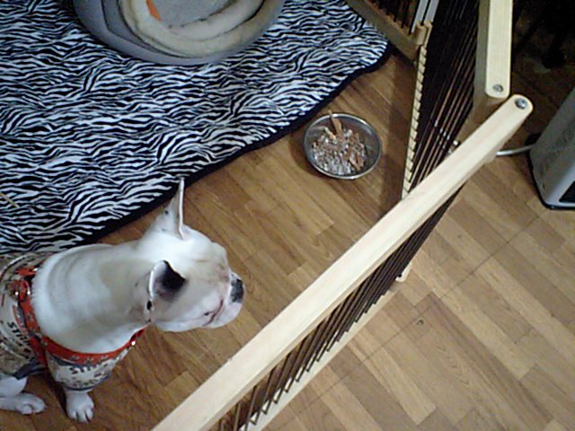 フレンチブルドックのこまめちゃんも、今朝はまだ口を付けません。