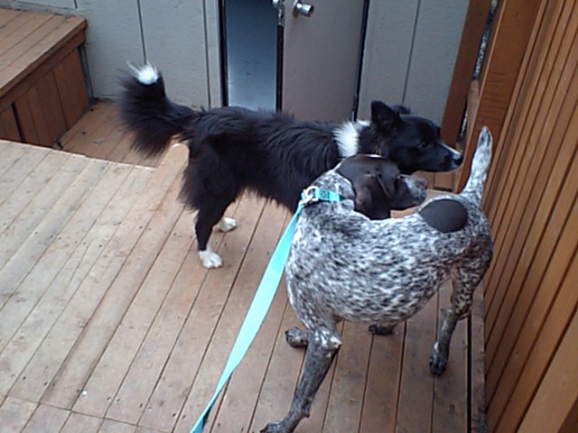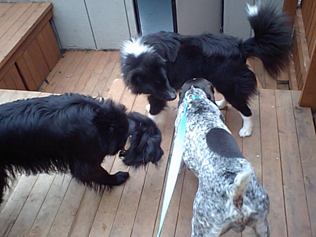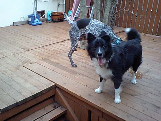 ご飯も終わったので、ボーダーのサエノスケ君も大型犬エリアで遊んでます。そこに毎日来るジャーマンポインターのモス君も合流しました。あまり犬と絡むのは好きでないモス君が、サエノスケ君には興味津々みたいです。