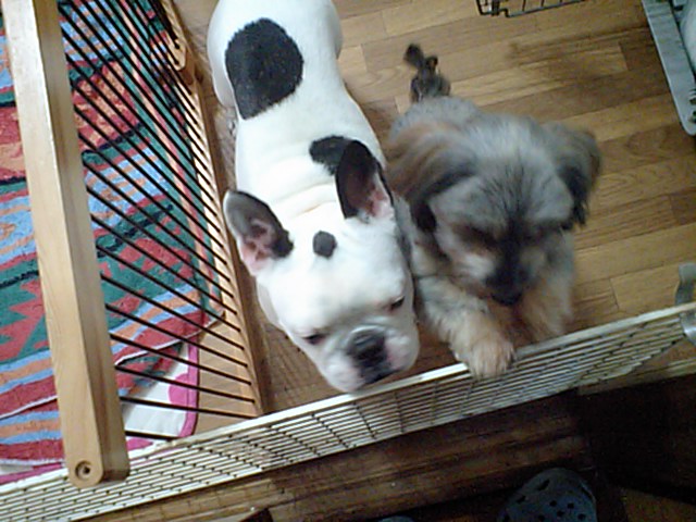 サークルの中にいたフレブルのアトム君、出たがるので出してあげたら他のワンコとも仲良くしてます。