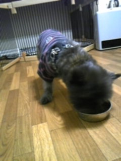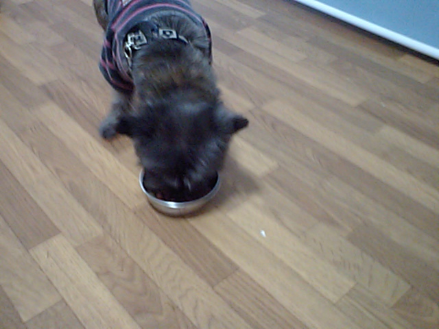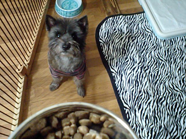 ケアンテリアのチッピちゃん、お待ちかねのご飯をたちまち完食してますよ。