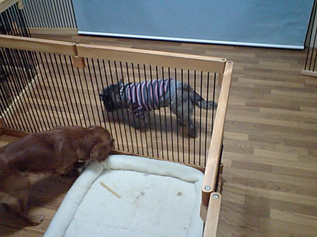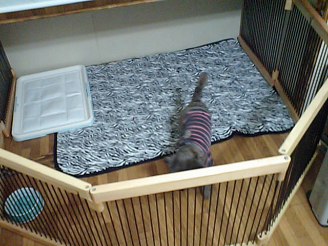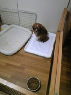 飼い主さんと離れて少し泣いてました。 今は大人しくサークルの中に居ますよ。
