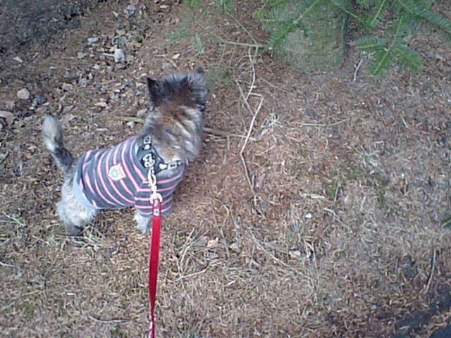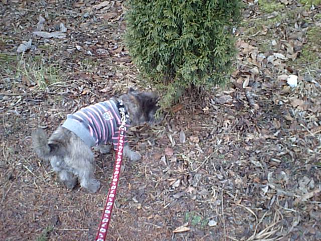 ケアンテリアのチッピちゃん、おさんぽでおしっこです。