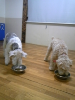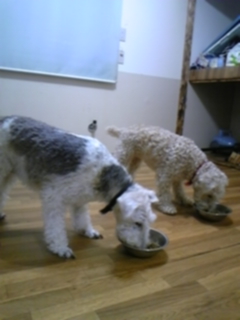 レイキーのビビちゃんとワイヤーのムージャンちゃん、二匹仲良くご飯です。
