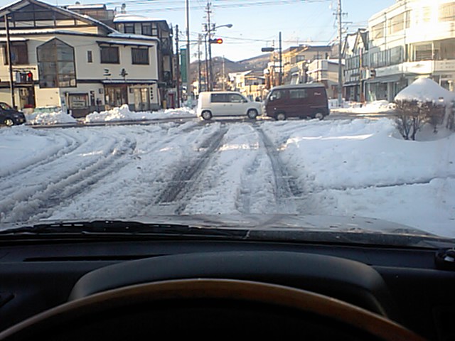 軽井沢駅前は圧雪路面でワダチが出来ています。深さは10センチ位でしょうか?