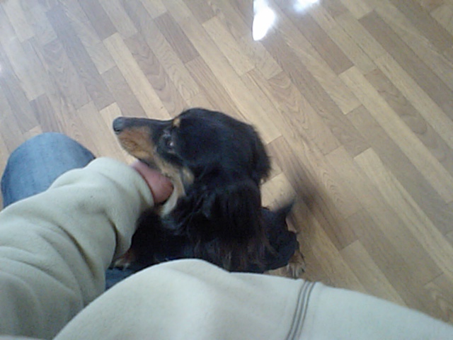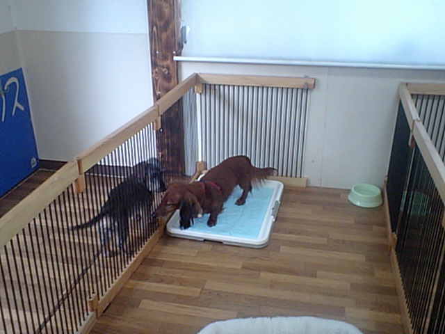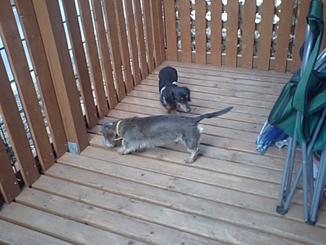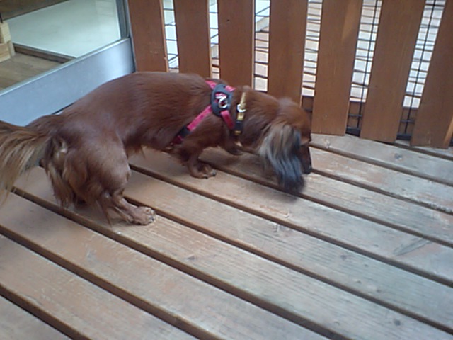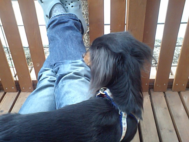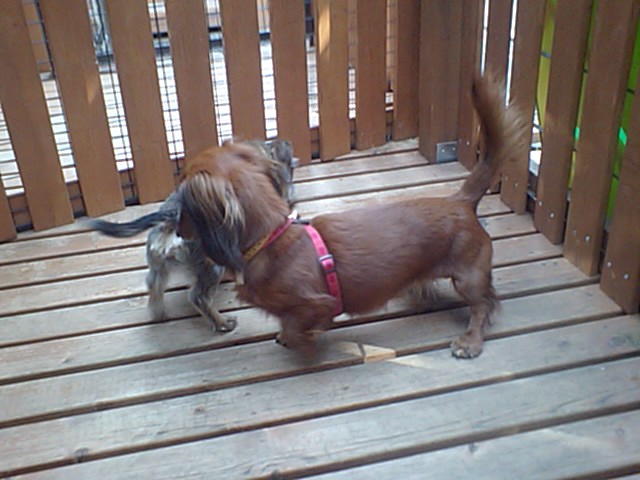 今日は暖かいのでデッキに居ます。ダックスルシア君もサークルから出てきて、ダックスウィル君とご挨拶してます。二匹で仲良くしてますよ。ダックスぶーちゃんも挨拶しましたが、やっぱりぶーちゃんは店長に「抱っこ抱っこ」。結局は店長の膝の上に居ます。