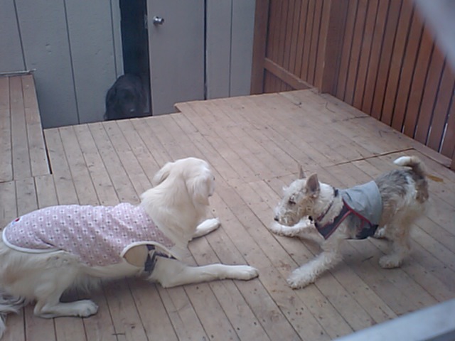 大型犬エリアにはワイヤーのロビン君が合流しました。ゴールデンのオリーブちゃんも、やっとダディーの雰囲気になれたみたいです。