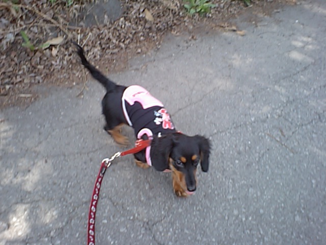 ダックスのハッピーちゃんとオプション散歩してきました。 あまり歩きたくない様子、店長が抱っこして歩いてました。