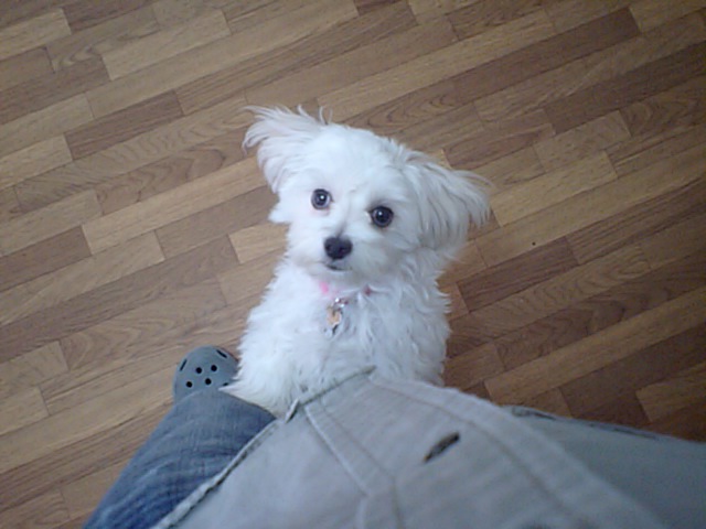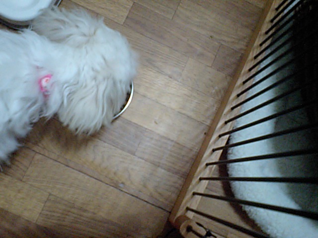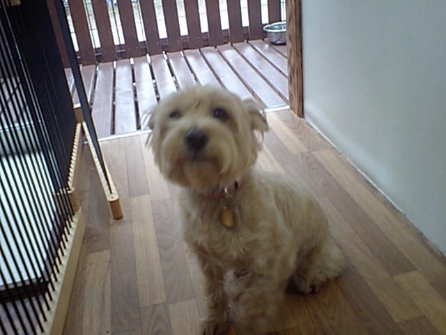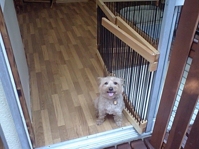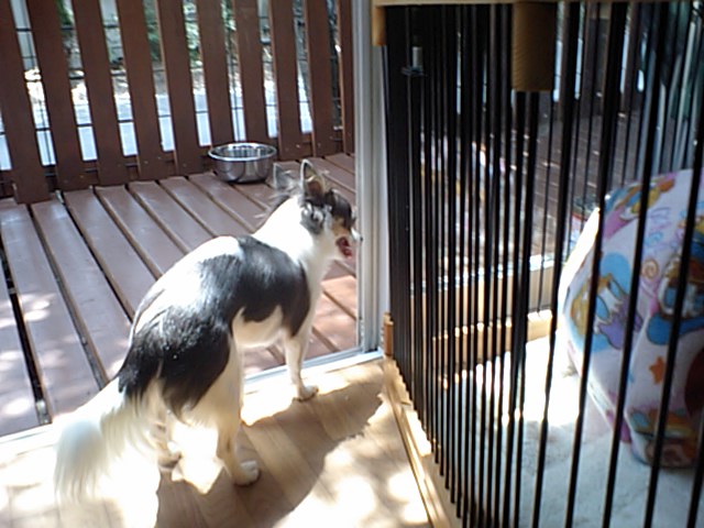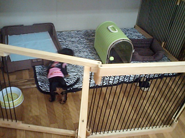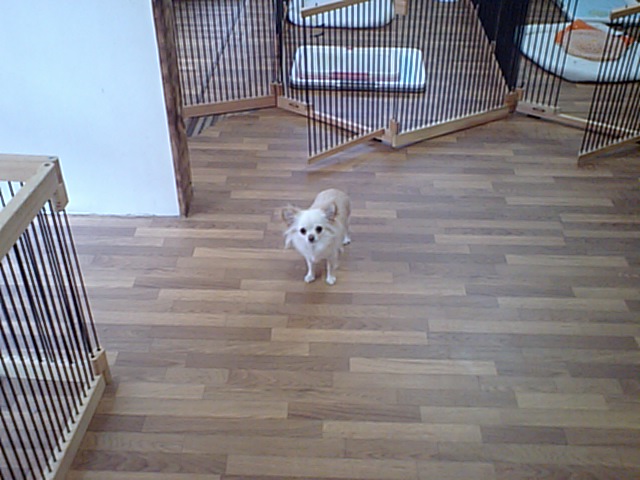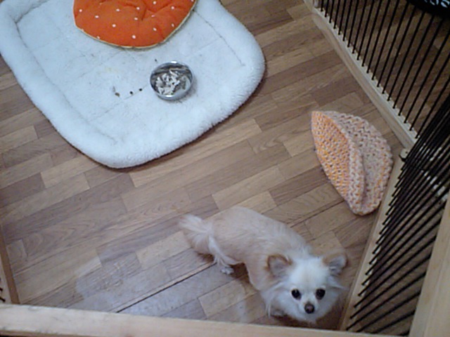 飼い主さんが居なくなって、探して少し吠えてました。でもすぐに落ち着いて、今はサークルの中に居ます。