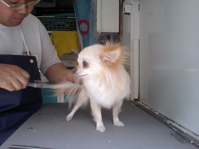 移動シャンプー車のクープーさんが来て、今はシャンプー前のブラッシングしてます。