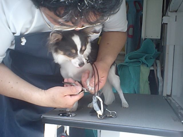 チワワのマリンちゃんに続いて、今度はサクラちゃんがシャンプーです。 シャンプー前にブラッシングと爪切りをしてるところです。