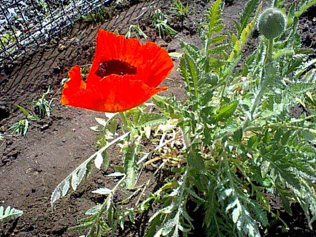 お隣の奥様に頂いたポピー、今朝から真っ赤な花が開きました。